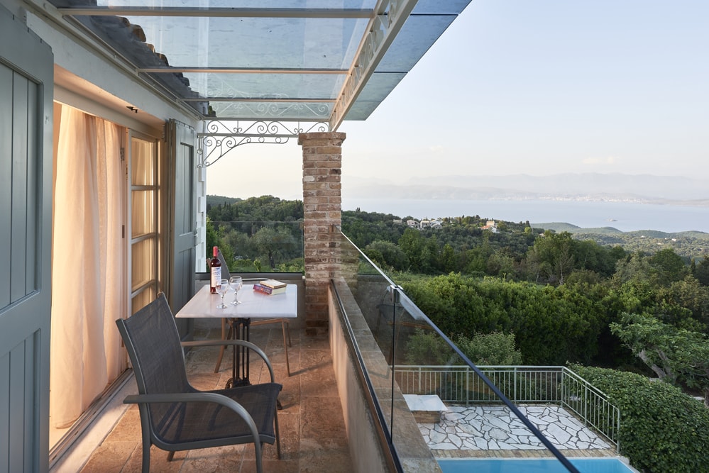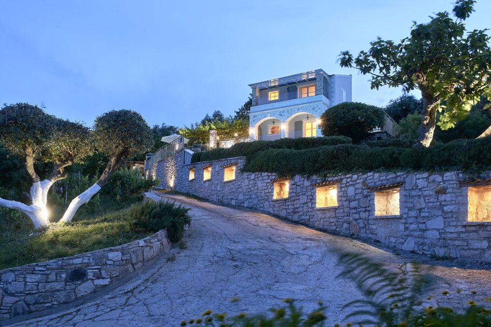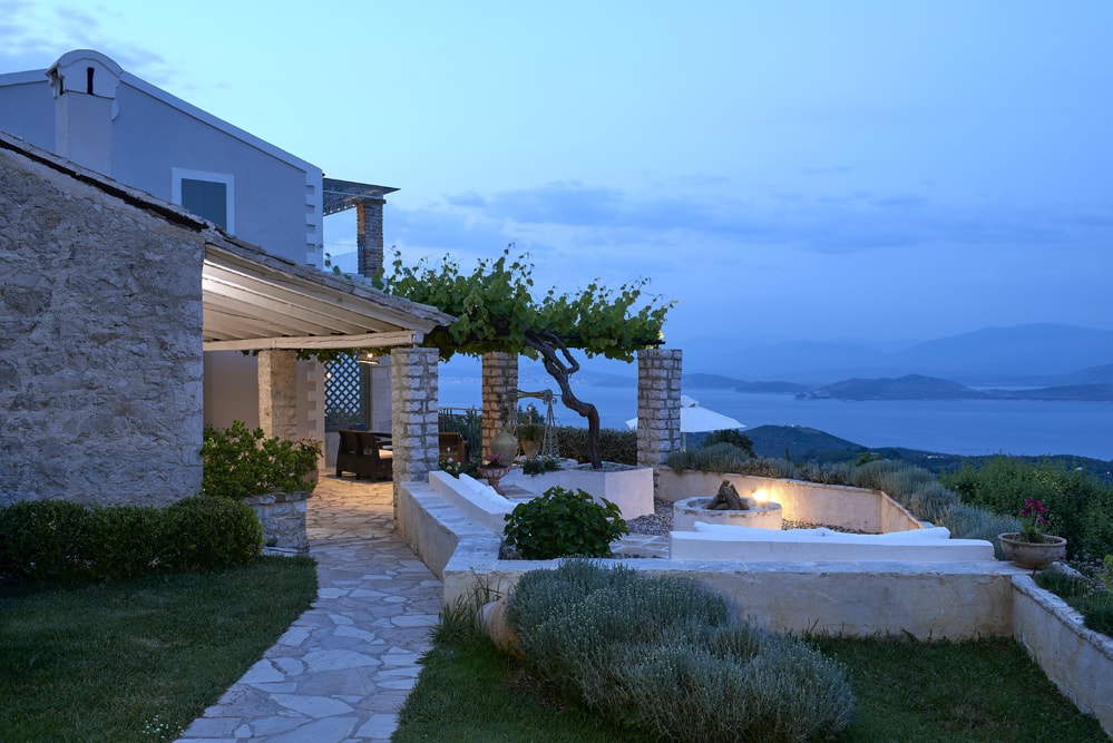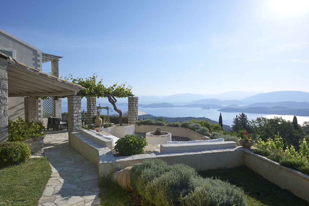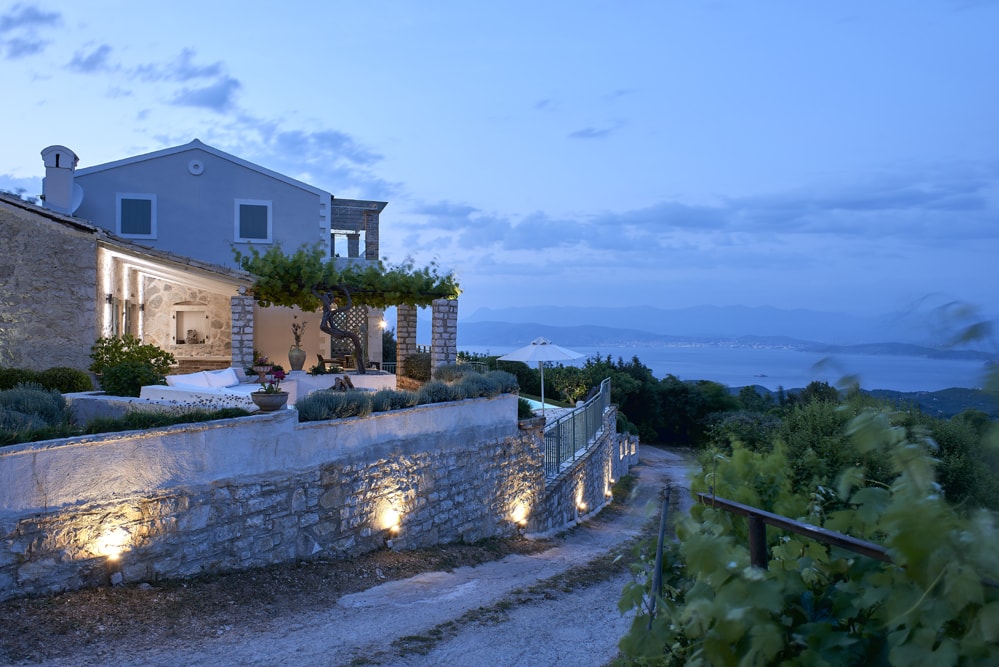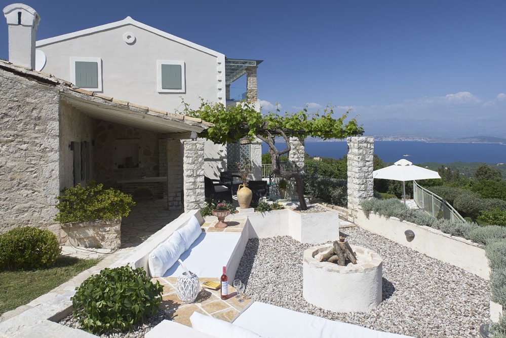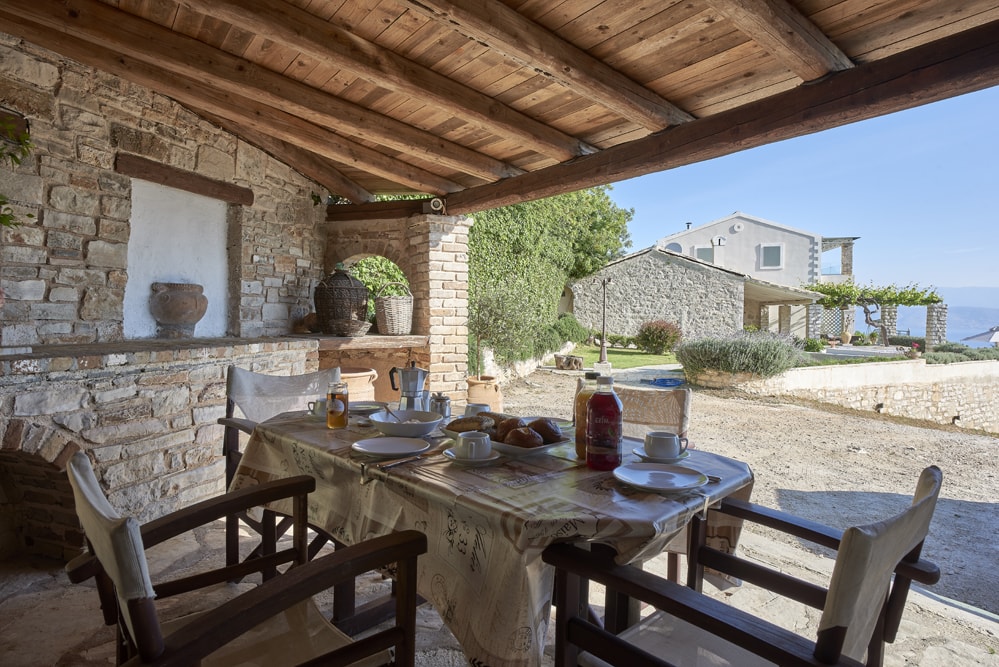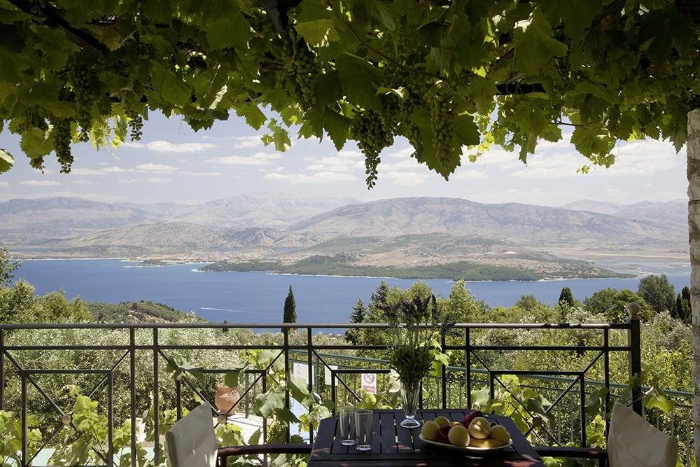 An old stone village high in the hills behind the coast between Kalami and St Stephano, is about fifteen minutes’ drive from the sea. It stands on the cusp between olive groves that thrive at a lower altitude, and the almond trees, open hillside, and vineyards of the mountain. Largely contained in a loop of the mountain road approach, the air is cool, the area quiet enough to hear the bees and the cicadas, and the views on a holiday down across the coast to the mountains of Albania are to die for.