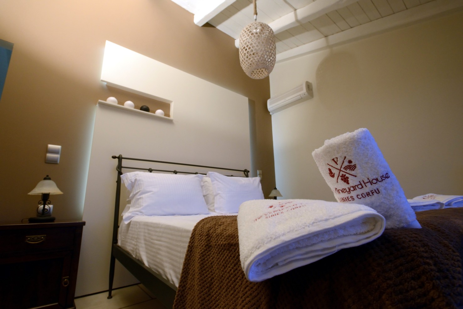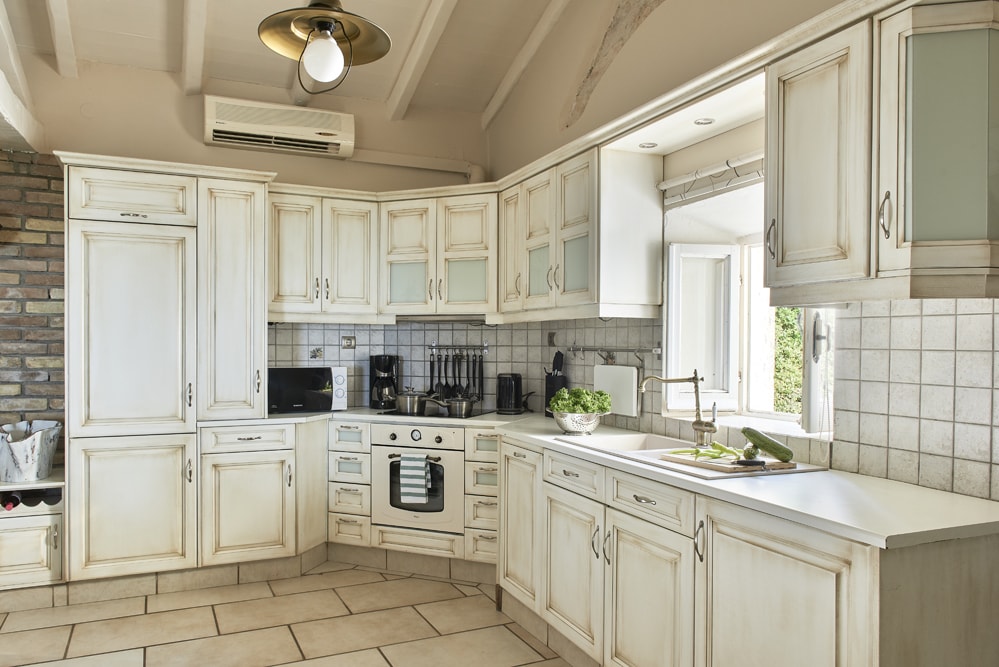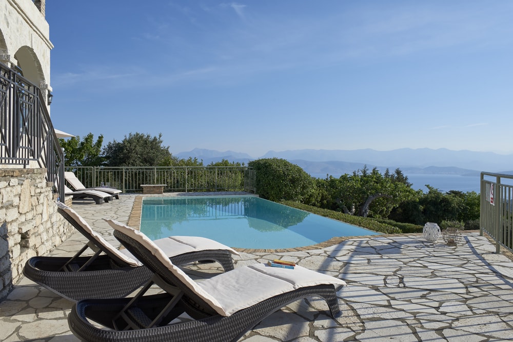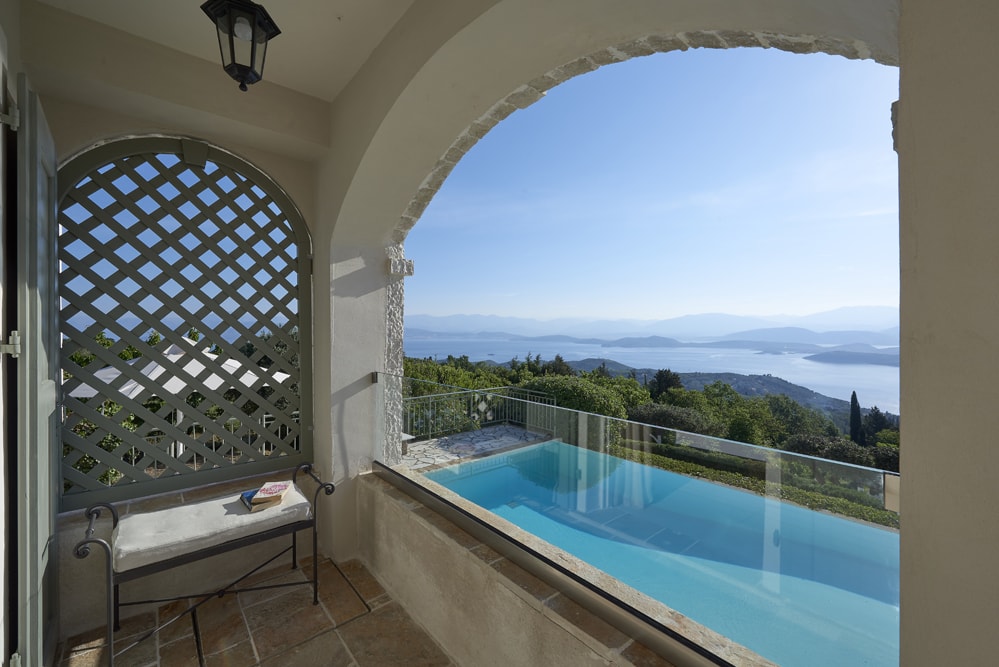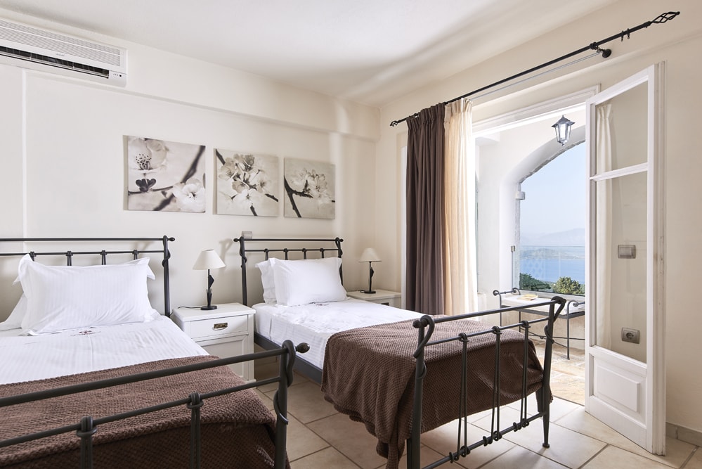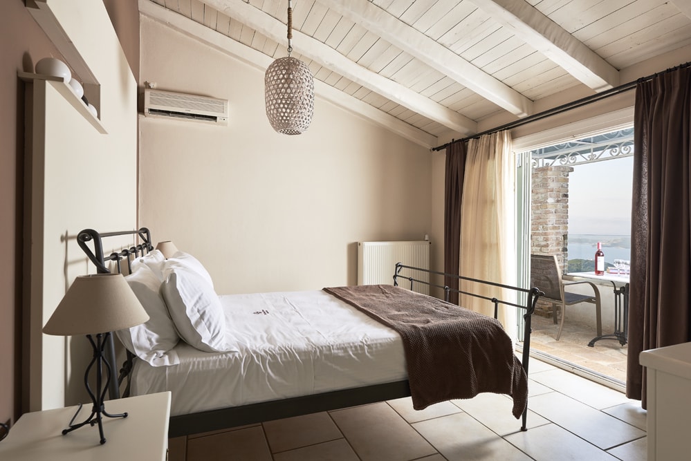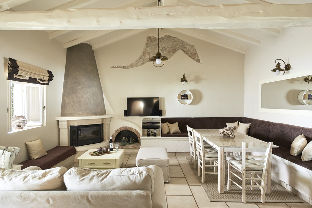 An old stone village high in the hills behind the coast between Kalami and St Stephano, is about fifteen minutes’ drive from the sea. It stands on the cusp between olive groves that thrive at a lower altitude, and the almond trees, open hillside, and vineyards of the mountain. Largely contained in a loop of the mountain road approach, the air is cool, the area quiet enough to hear the bees and the cicadas, and the views on a holiday down across the coast to the mountains of Albania are to die for.